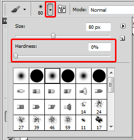 Then go to the top left corner and you'll see a menu like the one below. There click the down arrow as shown in the figure and change hardness to zero. Mind you, you can change the brush size if you want too.